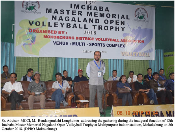 Mokokchung, 09 October: Monday din 13th Imchaba Master Memorial Nagaland Open Volleyball Trophy 2018 toh Multi-purpose Indoor Stadium, Mokokchung deh suru hoise. Etu din deh inaugural (suru) match toh Defending Champion, Sakutemjen Memorial Club, Chungtiayimsen pora Lakhuni Sporting Club logode 3 (Three) straight sets jeti lowah thakise. Short speech time deh Patron, M. Bendangnukshi Longkumer, Sr. Advisor MCCI pora junideya field deh dangor naam bonabo karni life de discipline thakibo lagi koise. Tai Town laga public playground beya thaga de saijai kena playground toh eki logode meli kena bonabole janaise. Etu agae programme time deh, I. Tsukjempokba, Convenor, Planning Committee pora welcome address dese. Apex Group pora be dance routine kora thakise aro Marep Kids Choir pora Special Song kora thakise. Etu sal laga edition Trophy deh Eight Teams hesha loi ase.