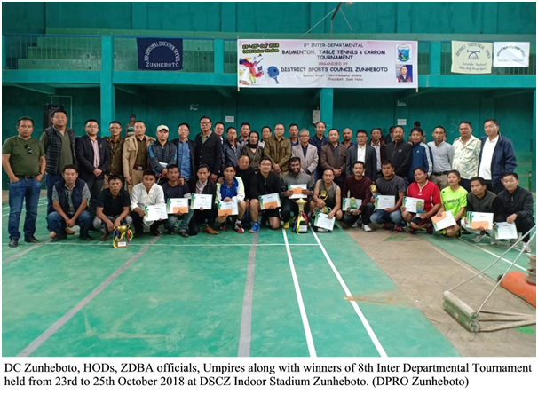 Zunheboto, 25 October: Zunheboto deh 23rd October  pora 8th Inter Departmental Tournament suru howah toh 25th October 2018 deh kothom hoise. Etu tin-din tournament toh DSCZ Indoor Stadium Zunheboto jaga deh loise. Sob-meli kena 37 departments toh badminton, table tennis aro carom deh hesha lowah thakise. Tournament deh jeta khan laga naam nejide lekhi kena ase.