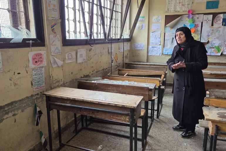 Syria, 13 January 2026: Chula goli shell classrooms aro corridors letara kuri shey Qassem Amin school laka Aleppo la Ashrafied neighbourhood te. Desks khan stairwells barricade kuri shey, glass khan shattered windows pra. School la playground toh battleground hoishey last week, fierce fighting la front line te bhui kina fighters bitor te Kurdish-led Syrian Democratics Force (SDF) aro Syrian government forces laka.