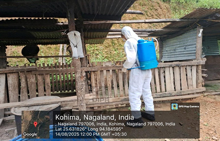 Kohima, 14 August 2025: Jakhama, Dr. Menguzenuo Chielie, aru Veterinary Dispensary aru VHC Kigwema pora paravet khan mili kina, 14th August 2025 te Kigwema aru Mitelephe village te ASF affect hua farm khan te disinfection aru containment measures kori dishe.