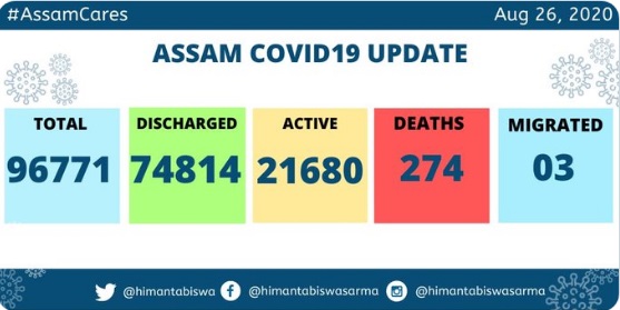 AUGUST 27,2020: Assam Wednesday te aro bi 14 patients khan COVID19 infections para murishe.etu para state laga total mura toll toh 274 hoishe aro komti hoilebi state te etu din te 2,179 new positive cases olaikena ase.