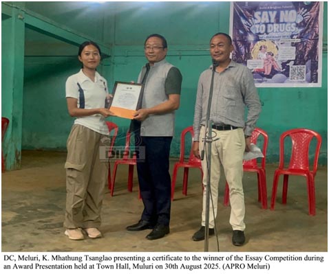 August 01, 2025, 07:43 PM: Essay Writing Competitionoportey award presentation programme loishey, itu 5th Anniversary Commemorate kurikena, Nasha Mukti Bharat Abhiyan (NMBA) Campaignlaga, kuntutohhoileyTown Hall, Meluritey para loishey, 30th August, 2025 tey. Itu essay likhalaga topic khan tohhoiley :Drug Abusearuitu para hoalagabiya effect khan Society tey; ekta Drug Free Melurihoboleylagamoi laga sapnaaru Kiley Moi Drug ke No koboleylagey, itu khan topic thakishey.