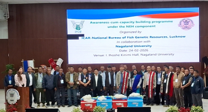 Nagaland, 24 February 2026: Ekta Awareness-cum-Capacity building programme NEH component under te successfully organized kuri shey 24 February 2026 te I. Ihoshe Kinimi Hall te, Nagaland University Lumani te. Programme toh organized kuri shey ICAR-National Bureau of Fish Genetic Resources, Lucknow pra collaboration te Nagaland University lokot, sustainable aquaculture practices kara kuribo leh objective lokot aro scientific fisheries development promote kuribo leh North Eastern Hill (NEH) region te. Programme toh Dr. Kajal Chakraborty, Director, ICAR- NBFGR, Lucknow, tai pra convened kuri shey, kun gathering toh virtually address kuri shey aro ekta overview present kuri shey Bureau’s initiatives laka NEH region te. Tai pra fish germplasm conservation, brood bank development, biosecurity measures aro farmer-oriented capacity-building interventions highlight kuri shey aimed kura regional fisheries productivity bhal kuribo leh. Inaugural session toh Farmers’ Extension Booklets la release b thaki shey Nagamese aro AO khota te scientific fish farming practices support kuribo leh grassroots level te.