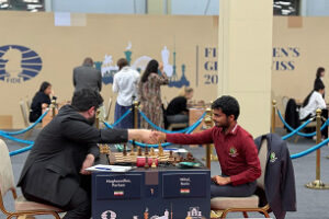 Uzbekistan, 12 September : Indian Grandmaster Nihal Sarin Iran laga Parham Maghsoodloo uporte ekta dangor jeeti loi FIDE Grand Swiss te Samarkand, Uzbekistan...