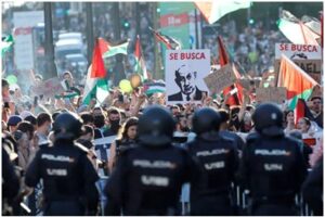 Spain, 15 September 2025: Pro-Palestinian demonstration khan Madrid te Vuelta a Espana cycling race’s final stage laka abandonment forced kuri shey, tadeh...