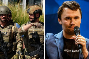 United State, 11 September 2025: Heavily armed policed khan door-to-door search kuri ase suspect karne kun influential conservative activist Charlie Kirk ke...