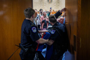 Washington, March 5, 2026: Ekta protester aro tinta US Capitol police officer jokhom pai she, tai khan laga jokhom ke treatment de she ekta Senate office...