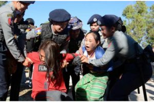 YANGON (Reuters)Police aro protest leader koishe Myanmar police para protestors khan ke khedabole nimite tai khan opor te rubber guli (bullets), tear gas aro...