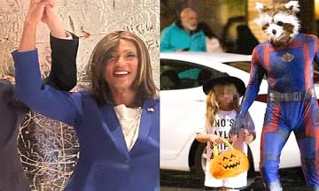 Lemon aro taila partner Tim Malone tho President Joe Biden aro Vice President Kamala Harris laka kapra chulai nah taikan keh tribute id shae. Former CNN host tho Harris nishi nah dress up kui shae, Tai blue pants, suit aro wig lakai shae Harris mili boleh. Malone tho Biden nishi nah dress up kuri shae. Taijun b America n flag kuri nah taki shae.
