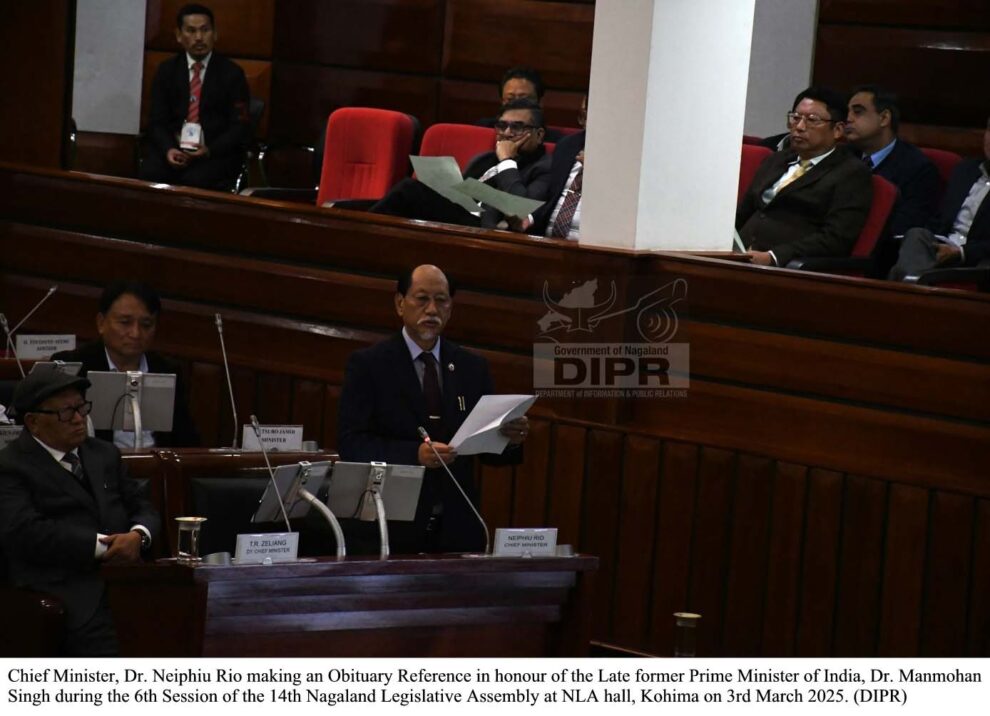 March 03, 2025, 06:16 PM: Itu 14th Nagaland Legislative Assembly laga first din laga Sixth Session tey, itu Nagaland laga Chief Minister – Dr. Neiphiu Rio para 3rd March 2025 tey, Nagaland Legislative Assembly hall, Kohima tey ekta obituary reference banaishey, itu late former India laga Prime Minsiter – Dr. Manmohan Singh, kun toh hoiley 26th December, 2024 tey muri jaishey, tai 92 saal laga age thaka tey, Delhi tey.