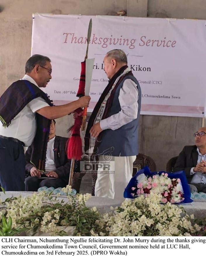 February 04, 2025, 05:38 PM: NDPP State Treasurer, Dr. John Murry para Chumoukedima Town Council laga Councilor Government nominee – Longshi Kikon laga honour karney itu thanksgiving service tey kotha kuri kena koishey ki, itu Chumoukedima town toh hoiley ekta town council hisap thaki thakiboley laga nahoi aru bhabana toh yaety bhi ekta Municipal Corporation deserve kurey koi kena, itu event toh hoiley LUC Hall Chumoukedima Town tey para loishey, 3rd February, 2025 tey.