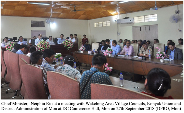 MON, SEPTEMBER 28 : Nagaland Chief Minister Neiphiu Rio toh Wakching Area Village Councils, Konyak Union aro District Administration, Mon laga kan logot meeting manaise. Etubi 27th September 2018 te Conference Hall, DC Office, Mon te. Aro etu meeting mana toh National Highways (SARD-NE) Merankong-Tamlu-Mon rasta, Wakching Area te banabole karne kotha mela kuribole karne mana laga ase koise.