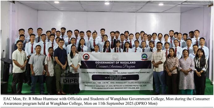 September 15, 2025, 06:29 PM: Itu Legal Metrology & Consumer Protection laga Department para IQAC Wangkhao Government College Mon logotey collaborate kuri kena, ekta Consumer Awareness program organize kurishey, 11th September, 2025 tey, Wangkhao College tey, tatey EAC Mon, Er. R Mhao Humtsoe toh special guest hisap buhi kena. Itu program toh hoiley, itu “Legal Metrology & Consumer Protection: The journey towards Viksit Bharat 2047” laga theme under tey loishey.