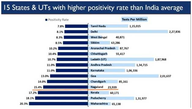 Friday te MoHFW para aji, 23 Oct, 2020 tak Desh te 10 crore COVID-19 tests lowa te janaideya samai, 15 States /UTs laga khobor COVID Positivity Rate te national figure para be besi howa janaishe. Nagaland State toh besi COVID positivity rate te national figure para besi howa te 15 States/UT majode ase.