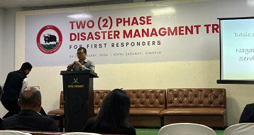February 26, 2026: Dimapur tey 2nd Phase Disaster Management Training loishey, Hotel Saramati tey para, first responder khan nimitey, kuntu toh hoiley emergency tyaari thakiboley, response skill khan aru coordination thakiboley, disaster khan laga homoi tey.