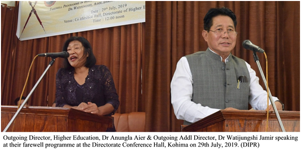 Kohima, 30 July: Directorate of Higher Education para jai thaga Director, Dr. I .Anungla Aier & Addl. Director, Dr. Watijungshi ke hisaab korikena 29th July 2019 deh farewell programme loise. Programme toh conference hall, Directorate of Higher Education, Kohima deh loise.