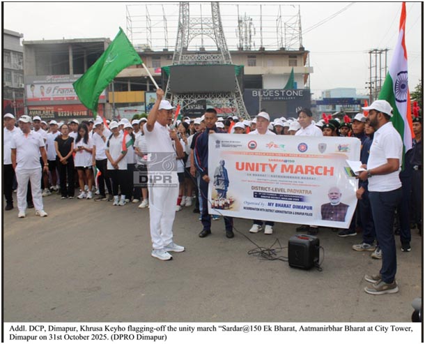 October 31, 2025, 05:03 PM: Itu District Level Padayatra, itu Sardar @150 Unity March Campaign under tey successful para conduct kurishey, Dimapur district tey, 31st October, 2025 tey, itu 150th birth anniversary commemorate kuri kena, SardarVallabhbhai Patel laga, kun ke toh India laga Iron Man koi kena jani pai thakey. Itu event toh hoiley MeraYuva Bharat (MY Bharat) para organize kuria laga thakishey, itu Youth Affairs aru Sports laga Ministry under tey, itu District Administration, Dimapur, aru Dimapur Police laga coordination thaki kena, alag alag line department khan para support thaki kena.