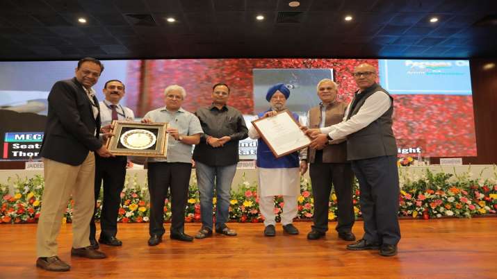 DMRC Managing Director Mangu Singh para etu award toh Union Minister of Housing and Urban Affairs Hardeep Singh Puri para 14th Urban Mobility India (UMI) Conference 2021 te dishe.