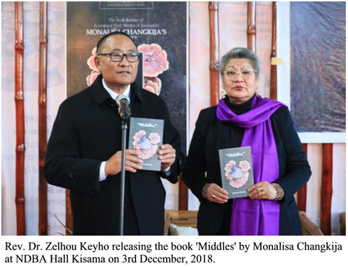 Kohima, 03 December: Hornbill Festival laga part hesab deh, Monday din NDBA Hall, Naga Heritage Village, Kisama  jaga deh, Naga renowned poet, writer & journalist, Monalisa Chankija laga book titled “Middles” toh NBCC General Secretary, Rev. Dr. Zelhou Keyho pora olaise.  Changkija pora “Middles” toh story-telling laga ase, hoilebe fiction nahoi koikena janaise. Book suru (inagurate) kora time deh tai pora kowah toh, literature toh etu pora othibo lagi aro manu khan etu pora putli hobo lagi. Tai aro kowah toh, writers aro poets toh khali aji-kali ekala nahoi kena ahhibole din time debe jawab debole para laga hobo lagi. Programme laga chairperson Dr. Avinuo Kire pora Monalisa Chankija laga olob kotha janaideya thakise. Tai pora North East deh Monalisa Chankija toh English Daily ‘Nagaland Page’ laga editor, proprietor aro publisher thaga toh ekala maike ase koikena janaise. Tai ke 2009 Chameli Devi Jain Award powah toh Outstanding Woman Mediaperson nemide ase. December 14, 2009 deh tai logode Poetry Society of India pora 25 sal laga Poetry award dese. Etu toh tai Nagaland deh ektum phal pora poetry deh motob kora pora ase. Naga Students Union, Delhi pora be tai logode NSUD Inspiration Award 2013 deya thakise. Tai logode Nagaland Governor’s Award toh Jan 26, 2014 deh powah thakise. April 26, 2014 deh FICCI Ladies Organization, Norttheast Chapter pora be tai logode 2013-2014 sal laga 30th FICCI Woman Achiever deya thakise. Aji kali tai laga poems toh Nagaland University deh, under graduate aro post graduate English courses deh hekhai ase. Nagaland Board of School Education pora be tai laga poems toh Class IX karni karni Alternative English course loikena ase. North East Hills University pora be M. Phil course khan nemide tai laga kunbah poem loikena ase. Monalisa Changkij pora be Dr. Asangla Tsudir, editor of Heritage Publications aro Rev. Dr. Zelhou Keyho logode thanks janaideya thakise.
