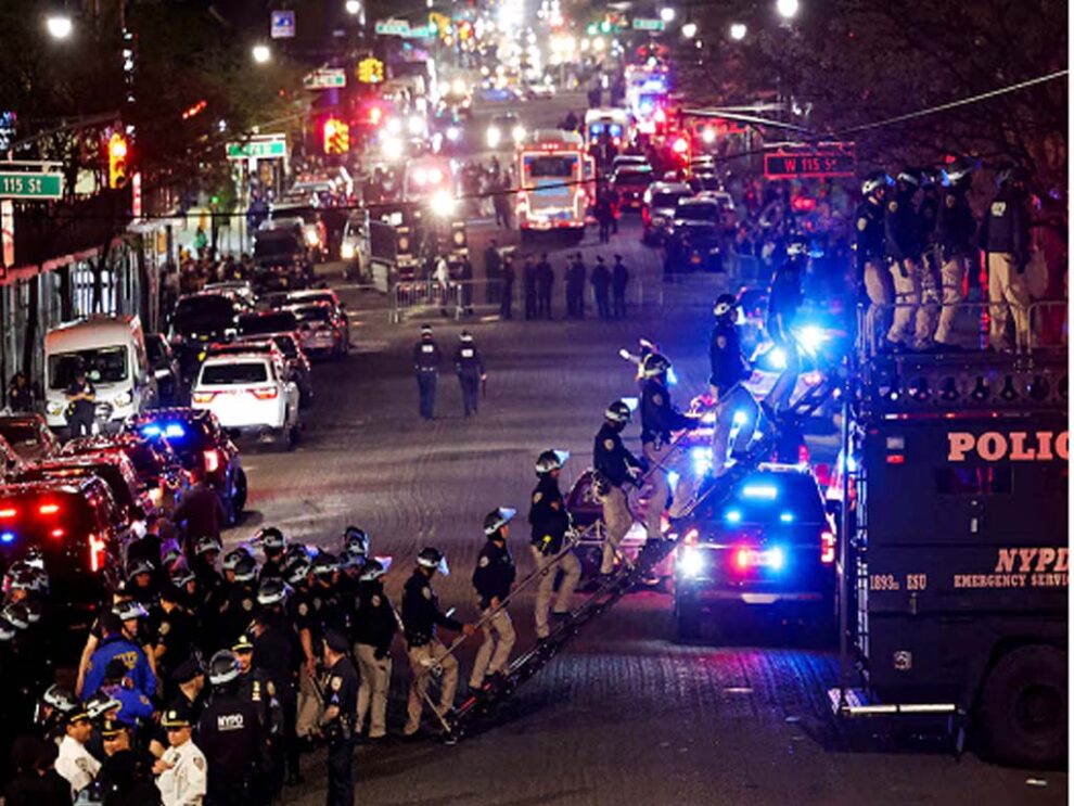 Itu New York police officer khan laga pichetey toh itu Manhattan campus laga gate khan laga bahar tey guard kuri ken akhara thaka laga toh dikhiboley parey itu railing khan para. Police laga surveillance drone khan ulaishey itu dusk akass para.
