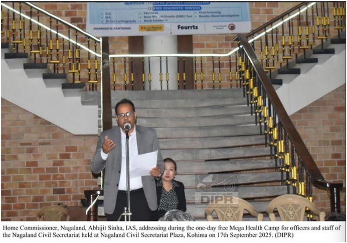 September 17, 2025, 07:40 PM: Ek din laga free Mega Health Camp loishey, officer khan aru staff khan nimitey, itu Nagaland Civil Secretariat laga, Nagaland laga Civil Secretariat Plaza, Kohima tey, 17th September, 2025 tey.