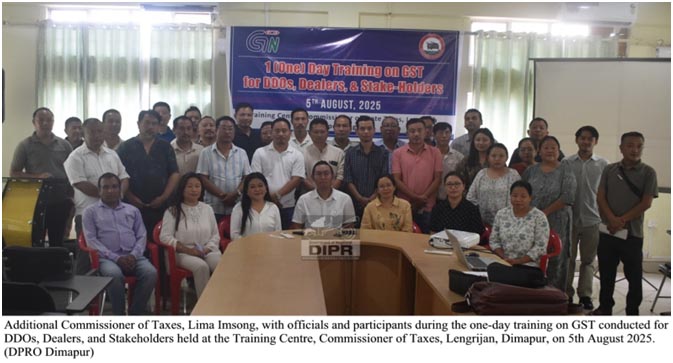 August 05, 2025, 05.55 PM: Ek Din laga training program conduct kurishey, Goods aru Services Tax (GST) opor tey, kuntu toh hoiley successful para conduct kuriboley, Drawing aru Disbursing Officers (DDOs), register kuri kena thaka dealer khan aru key stakeholder khan nimitey, itu Taxes laga Commissioner laga Training Centre tey, Lengrijan, Dimapur, Nagaland tey, August 05th, 2025 tey. Itu training toh hoiley, itu Taxes laga Department para aru Nagaland laga Commissioner para organize kuria laga thakishey, awareness aru compliance related enhance kuriboley karney, GST provisions laga related tey.