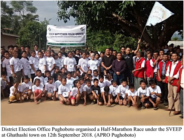 Agencies, 13 September: Thursday din Ghathashi town jaga de Half-Marathon Race loise. Etu Half-Marathon Race toh ECI laga Systemic Voters Education and Electoral Participation (SVEEP) programme pethor de DEO Pughoboto pora lowah (organise) thakise. Etu race de Gathashi town laga manu ekala nahoi kena osor bosti manu khan be hesha lowah thakise. Sr. men category de 1st Mukalimi village laga Vitoho, 2nd Mukalimi laga Boskha aro 3rd Mukalimi bosti laga Vikashe pora lowah thakise. Sr. Women category de, 1st Iphonu bosti laga Helito, 2nd Iphonu bosti laga Lovini aro 3rd Iohonu bosti laga Mishili pora loise. Junior Boys 1st Ghatashi town laga Kumsuto, 2nd Iphonu bosti laga Vipito aro 3rd Ghatashi bosti laga Viyeto pora loise. Jr. girls category de, 1st Ghatashi bosti laga Linovi, 2nd Heboli bosti laga Helivi aro 3rd Makali laga Neshebo pora loise. ADC & DEO Pughoboto Phulushe K. Yepthomi pora marathon toh ‘one man one vote’ laga message pora suru kora thakise.