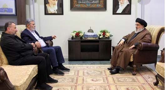 October 25, 2023: Isarel-Hamas war laka tension time deh chief of Lebanon-based Hezbollah Sayyed Hassan Nasrallah Wednesday din deh hamas deputy chief Saleh al-Arouri aro Islamic Jihad chief Ziad al-Nakhala lokot mili shae Beirut deh. Hezbollah laka al-Manar Tv isab deh, trio tho Gaza laka resistance deh victory achieve kuri bole plan kan discuss kuri bole mili shae kui shae.