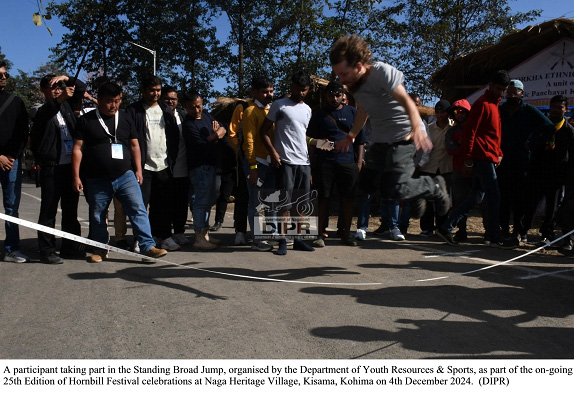 December 04, 2024, 05:53 PM : Youth Resources & Sports laga Department para successful para itu indigenous Standing Broad Jump game khan organize kurishey, itu chuli thaka Hornbill Festival celebration khan laga part thaki kena, Kisama tey, 4th December 2024 tey. Itu competition toh hoiley khula thakishey, visit kuriboley jawa tourist khan karney, kotey toh hoiley ekta exciting participation thaka laga dikhi paishey, fourteen athlete khan laga, duita foreign tourist khan milai kena.