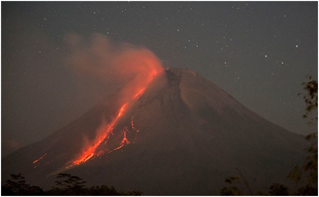 JAKARTA, INDONESIA: Indonesia’s most active volcano Mount Merapi toh  Monday te olaishe  etu para hawa toh  ash khan thakishe etu  te  crater para red lava ola pichede.