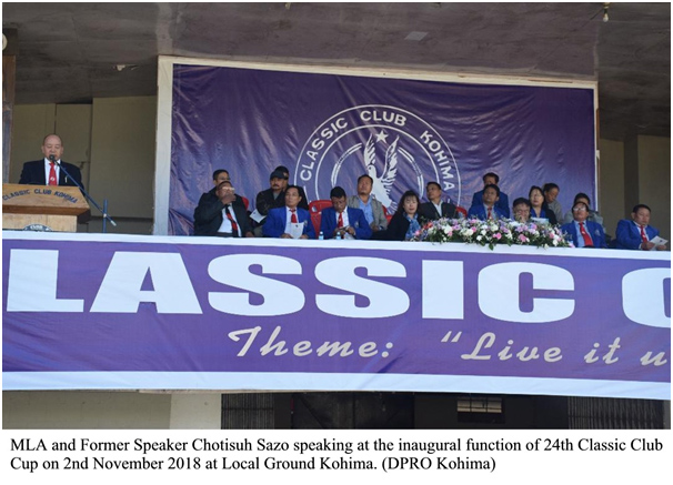 Kohima, 03 November: Friday din Khuochiezie Local Ground Kohima  jaga deh 24th edition classic club football tournament toh MLA aro  Former Speaker Chotisuh Sazo pora suru korise.  Event din deh MLA aro Former Speaker NLA Chotisuh pora football toh promote koribo lagi koise. Tai pora jawan khelari khan logode phal pora football khelibole aro tai khan laga skills dekhabole kowah thakise. Kelay koile ahhibole din time deh tai khan toh state laga sports hobo karni. Tai pora besi phal-phal khelari khan toh classic club cup pora olai koise. Tai pora be hesha lowah yeam khan ke mondangor kotha janaideya toh, ke laga field deh hoilebe professional aro expert hobo karni patience, decipline aro ektun dukh pora training koribo lagibo. Tai pora Naga youth khan toh softball, sepaktakraw, riffle shooting aro archery nesana khan deh besi talent ase koise. Etu pora duniya deh ekta phal jaga bonai kena thakibo karni sports pora talent dekhabole, notun sati bonabole, morom koribole aro ekta-ekta logode respect koribo karni janaideya thakise. Tai pora Classic Club organise kora karni kushi powah kotha janaise. Kelay koile etu even pora state laga jawan talents khan logode promote kora karni. Welcome speech deh President Classic Club, K. Neibou Sekhose pora kowah toh, duniya deh 96% manu khan toh sports deh hesha thakise nahoile avid fans khan ase. Tai pora aro kowah toh, sports toh ekta olob activities ase. Etu pora manu khan laga color, race, language, religion, age aro gender deh na-sai kena eku logode anni. Tai pora Classic Club Silver Jubilee toh 2nd October 2018 pora suru hoise aro etu toh final 25TH Classic Cup 2019 time deh kothom hobo. Tai pora championship khan logode Trophy aro certificate logode Rs. 1.00 Lac pabo aro Runner up logode Trophy aro Certificate logode Rs. 80,000 pabo koise. Function time deh host nemide Dr. Rukulu K. Puro thakise, Dziesetuo Soukhrie, Pastor, CRCK Kohima pora prathana kora thakise aro special song toh Kekhrie Ringa pora gaa thakise.