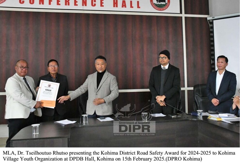 February 15, 2025 07:35 PM: Itu Kohima District Road Safety Committee para, itu Deputy Commissioner, Kohima, Kumar Ramnikant, IAS laga Chairmanship under tey, tai khan laga meeting laga homoi tey, January 17, 2025 tey, itu annual ‘Kohima District Road Safety Award’ constitute kuria laga thakishey, ekta district level award, Citation logotey aru ekta Cash Award ₹10,000 sob jon ke diboley karney. Itu award toh hoiley teenta manu khan ke, group khan, organization khan nahoilebi department khan ke dishey, kun khan para toh hoiley road safety karney contribute kurishey.