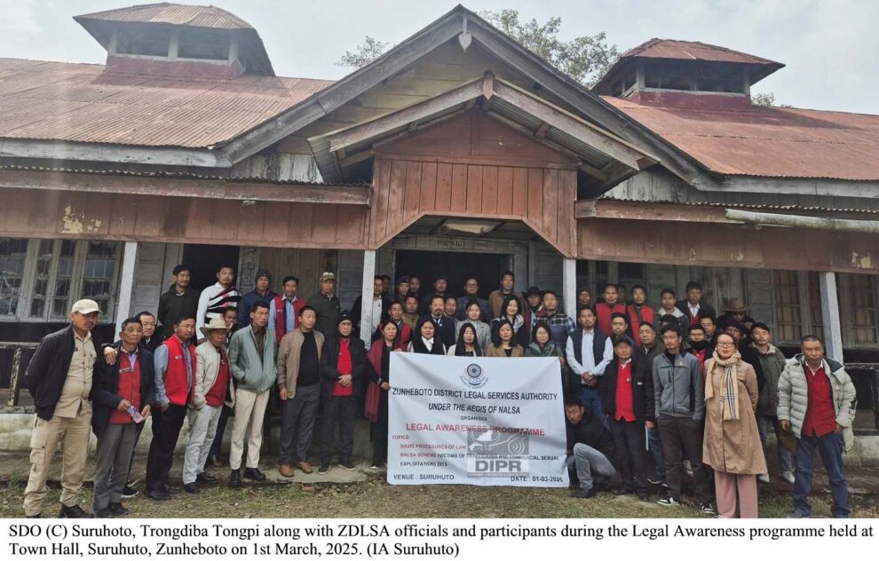 March 04, 2025, 07:03 PM: Itu Zunheboto District Legal Services Authority (ZDLSA) para Legal Awareness Programme organize kurishey, Town Hall tey, Suruhuto tey, Zuheboto district under tey, 1st March, 2025 tey, 14 bosti khan incorporate kuri kena, itu area bhitor tey. Itu participant khan aru attendee khan, awareness programme nimitey, Dobashis, GBs, village councils, church leaders, women association, student bodies aru para bhi thakishey, Suruhuto laga police personnel khan bhi thakishey.