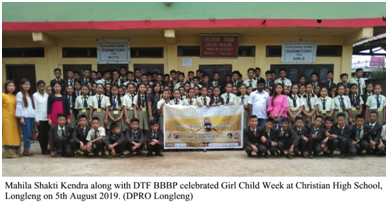 LONGLENG,AUGUST 06,2019: Mahila Shakti Kendra khan DTF BBBP logote milikena  Girl Child Week “Empowering Girls for a Brighter Tomorrow” bithor  Christian High School, Longleng 5th August 2019  te manishe .Etu celebration laga main objective toh  manu khan ke girl child righr aro life laga facts khan janaidibole ase aro  girl child issues Health, Respect, Education, Nutrition etc te bi kotha kurishe.