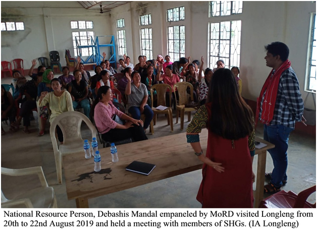 Etu cause ke support kuribole nimete National Resource Person, DebashisMandal  MoRD  logote milaikena akhe te Longleng te  20th para  22nd August 2019 tak   tin din nimete jaishe.Etu laga akhe dui din toh tai kunba VLOs aro SHGs Yongnyah aro Ponching  village te jaishe loan pattern aro  women members khan laga repayment adat toh janaibole nimete  .Etu uporte tai para arobi   future loan requirement SHGs khan nimete  kuntu toh lageh BLF Business plan bonabole nimete kotha kurishe .Etu 3rd din te tai ekdin lamba meeting loishe     aro  kotha khan kurishe   BLF laga executive members khan logote  etu  NSRLM laga staff logote etu  bi  finalise kurikena final Business plan karne future projection bonabole nimete .