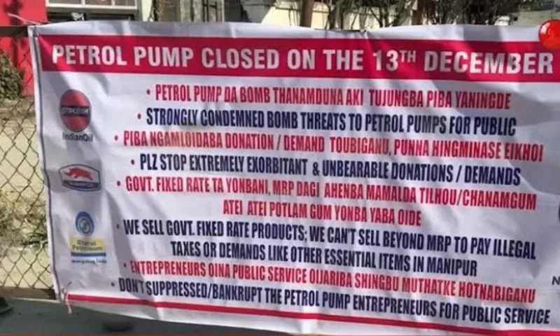 Imphal, December 14, 2025: Manipur petroleum dealers khan para ek din laga strike ja toh manu khan petrol komti ho toh dekhebole pareshe. Tai khan manu para bomb kuredebole laga damke dei karne tai khan strike jaishe. Tai khan sob pump khan bon kureshe. Aro black market khan laga dam toh beshi uthe jaishe koishe. Manipur laga petrol pump malik khan Saturday, December 13, 2025 te tai khan laga pump khan kholai nai, bomb laga dhamke aro illegal donation mange karne betor manu khan para. December 6, 2025, Imphal East District, Koirengi Road te, Ibudhou Pakhangba Filling Sation laga pesab kurei laga jaga te ekta hand grenade paishe. Aro utu hand grenade logo te letter thakeshe. Utu letter te likene thakeshe ki tai khan ki mange ase nadele toh bei hobo koine thakeshe. Manipur petroleum dealers fraternity aro fuel retailer, IndianOil, HP, Assam Oil, Bharat Petroleum, Goal Bio Oil aro Nayara Energy khan para etu dhamki aro demands khan toh condemned kureshe. Aro tai khan para koishe ki petrol pumps khan toh public service enterprises ase aro tai khan laga opor te enia nahobole lagei koishe.