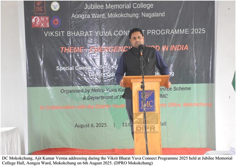 August 06, 2025, 04:42 PM: Itu Viksit Bharat Yuva Connect Programme 2025, theme toh “Emergency Period in India” thaki kena loishey, itu Jubilee Memorial College Hall, Aongza Ward, Mokokchung tey, 6th August, 2025 tey. Itu toh hoiley Nehru Yuva Kendra, National Service Scheme & Department of Political Science, JMC para organize kuria laga thakishey, itu District Youth Resource & Sports Office Mokokchung logotey collaborate kuri kena.