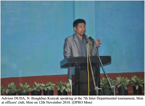 Mon, 13 November: Monday din (12th November 2018) officers’ club, Mon jaga deh 7th Inter Departmental tournament suru howah thakise. Etu din deh Advisor DUDA, N. Bongkhao Konyak toh special guest thakise. Advisor DUDA, N. Bongkhao Konyak pora officers aro organisers logode enaga tournament organise kora karni thakise janaideya thakise. Tai pora government servant khan logode society aro district othaidebo karni nejor laga kum aro post deh best kosish koribe kowah thakise. Tai pora district phal hobo karni tai laga department pora full support koribo koise. Special invitee DGP, Nagaland, T.J. Longkumer, IPS be opening ceremony time deh kotha kora thakise. Deputy Commissioner, Mon, Thavaseelan K, IAS pora be kotha janaideya thakise. Program deh Asst. Professor, Wangkhao College, Dr. Esther Konyak toh chair thakise. Police Baptist Church, Youth department pora special song kora thakise aro Principal ITI, Er. Alongse Sangtam pora wada kora thakise.