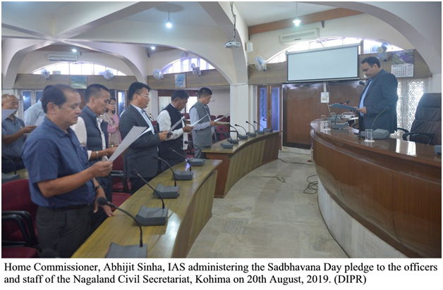 KOHIMA,AUGUST 20,2019: Nagaland State khan dusra state khan nishena   SadbhavanaDiwas manishe  aro  Nagaland Civil Secretariat laga staff aro officers khan ke  Home Commissioner, Abhijit Sinha, IAS kun etu programme laga chairman ase tai para Sadbhavana Day pledge loishe.