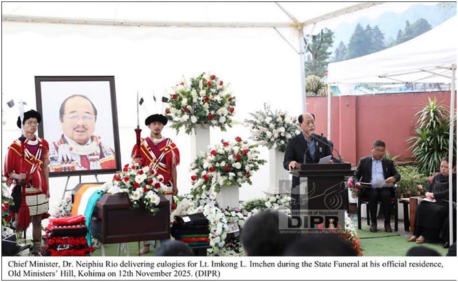 November 12, 2025, 07:19 PM: Nagaland para ekta emotional fare well bid kuriboley, late Imkong L Imchen, Information & Public Relations and Soil & Water Conservationke, State para ekta State Funeral accord kurishey, tai laga distinguished service aru contribution laga recognition tey, manu khan karney, tai laga official residence, Old Ministers’ hill, Kohima tey, 12th November, 2025 tey.