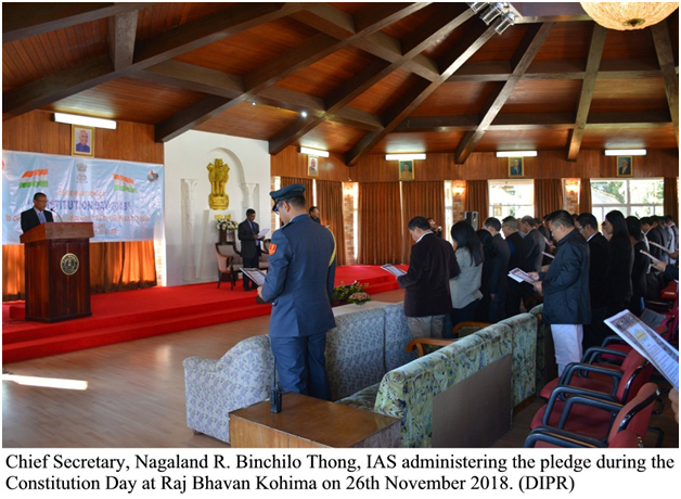 Constitution Day koi kena 26th November 2018 te manaise. Etu din te Chief Secretary, Nagaland R. Binchilo Thong, IAS pora Pledge aro bhal kotha kan kuridese aro janaidese. Tai bi etu Constitution te ami kan desh laga asul bhal babuna kana se aro etu pora ami kan Desh laga Constitution toh pachaidekena ahkete luijaidebole kuri ase koi kena janaise. Aro etu Constitution of India toh ami kan neju jaka laga ekta Fundamental Law ase koi kena janaise. Etu din te kotha kurikena President, High Court Bar Association, Ashiphri Zho pora etu Indian Constitution toh ekta bhal laga ase. Aro ami kan desh laga manu kan nemite ekta motub aro husa laga ase koi kena janaise. Tai bi etu Indian Constitution te 2 ta asul Sorkar Organs ase. Etu ke Executive, Legislature aro Judiciary kana se. Aro etu porahi ami kan Indian Constitution toh ami kan desh laga neju manu kan nemite ekta Supreme Law ase aro etu porahi ami kan sob logot aram aro shant pora thakibole de ase koi kena janaise.Senior Additional Advocate General, T.B. Jamir porabi etu din te kotha kurikena etu Constitution Day toh kinika huikena kam te julabole kurikena aha laga ase etu kan janaide thakise. Etu ke tai 2015, 26th November dak etu din toh “Law Day” koi kena manai thakise. Huilebi 2015 sal majutte hi India Sorkar kan kotha melai kena etu din edia toh Constitution Day koi kena manabole kotha mana kura laga ase. Etubi Constitution of India laga naam pora. Etu karne tai bi sob logot etu Constitution ulabole kura manu kan ke ekta hisab aro bhal adat dekhaidebole kuribi. Aro etu Constitution toh ahkete anedebole kuribi koi kena janaise.Nagaland Governor nemite Home Commissioner aro Commissioner & Secretary karne thaka Ramakrishnan, IAS porabi etu din te kotha kurikena Vote of Thanks janaidese. Etu ke tai ami kan Nagaland Governor, Shri PB Acharya pora ami kan state Sorkar ke etu din toh ekta bhal adat aro hisab pora manabole kuribole janaidiya laga ase koi kena janaise. Etu din laga Programme te Advisor Law aro Justice, Dr. Longrineken, Administrative Head of Departments, Head of Departments aro tusera Representatives kan alak-alak Organisations laga kan ahe kena thakise koise.