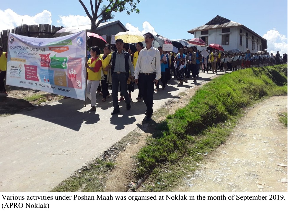 TUENSANG,OCTOBER 03,2019: Noklak 19th September 2019 ADC Noklak, Chaitanya Prasad, IAS para Poshan Maah shuru kurishe .Etu shuru huwa programme te komti hoilebi 650 manu khan bhaagh loishe. Administrative aro ICDS officials khan hi nohoikena AWWs, AWHs, BPM, ASHA Coordinator and ASHA health workers CHC Noklak, aro government schools Noklak Hqs bithor te thaka laga teachers aro students khan bhaagh loishe etu te adolescents, pregnant women aro lactating mothers aro children khan ase. AWCs Noklak Hqs bithor te distribution khan loishe ‘Nutrition and Sanitation’ laga theme bithor te CBEs khan loishe.