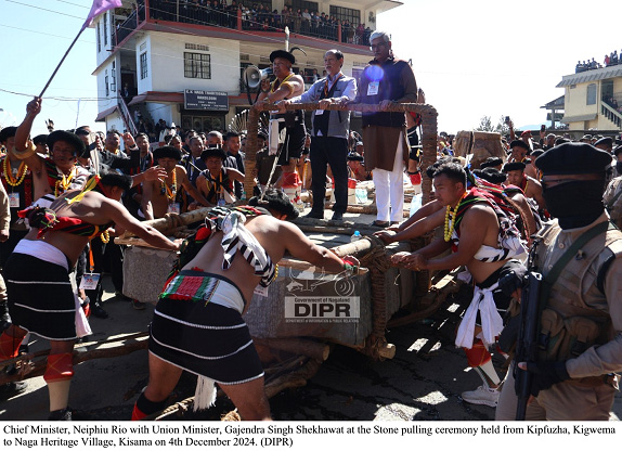 December 04, 2024, 05:32 PM: Itu celebration laga part thaki kena, itu Nagaland laga 25th Hornbill Festival laga, ekta grand Stone Pulling Ceremony toh hoiley loishey, Napfülezha, Kigwema TCP Gate para shuru kuri kena aru itu toh Kisama Heritage Village tey khotom kuri kena, 4th December, 2024 tey. Itu event toh hoiley Culture aru Tourism nimitey Union Minister – Gajendra Singh Shekhawat para tatey Chief Guest buhi kena grace kurishey, Nagaland laga Chief Minister- Neiphiu Rio logotey kun toh hoiley Chief Host thakishey, aru Tourism Minister Temjen Imna Along toh Host hisap buhi kena. Alag dignitary khan toh hoiley Advisor Er. Kropol Vitsu aru MLA Kevipodi Sophie thakishey, kun khan toh hoiley itu occasion ke mark kuriboley present thakishey.