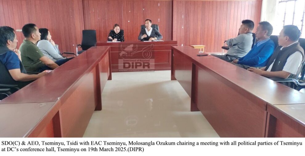 March 19, 2025, 05:39 PM: SDO (C) & AEO, Tseminyu, Tsidi aru EAC Tseminyu, Molosangla Ozukum para ekta meeting conduct kurishey, itu sob political party khan logotey, Tseminyu District under tey, Deputy Commissioner laga conference hall tey para, Tseminyu laga, 19th March, 2025 tey.