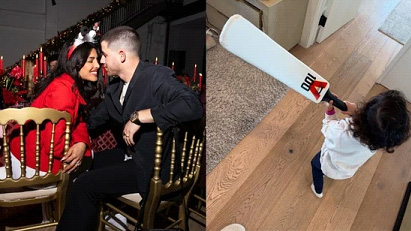 Priyanka para taila pet kuta kan b dikai shae. Ekta picture para Priyanka aro Nick laka maike bacha Malti Marie Chopra Jonas tho ekta cricket ball lokot deh kila dikai shae. Bacha tho picture deh kun bah games kan kileh taki shae. Ekta photo para Matli, ekta kah saman kushi para kah dikai shae. Last photo deh Nick tho snowman headband ekta lakai taki shae.