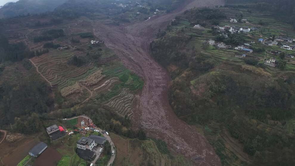 China, 9 February 2025: Emergency teams khan China’s southwestern Sichuan province te time against khili shey 28 manu ke bisaribo leh kun khan hari jaishey barish pra triggered kura landslide hwa pichdieh kun toh ekta manu murai dishey aro ghor khan loi jaishey.