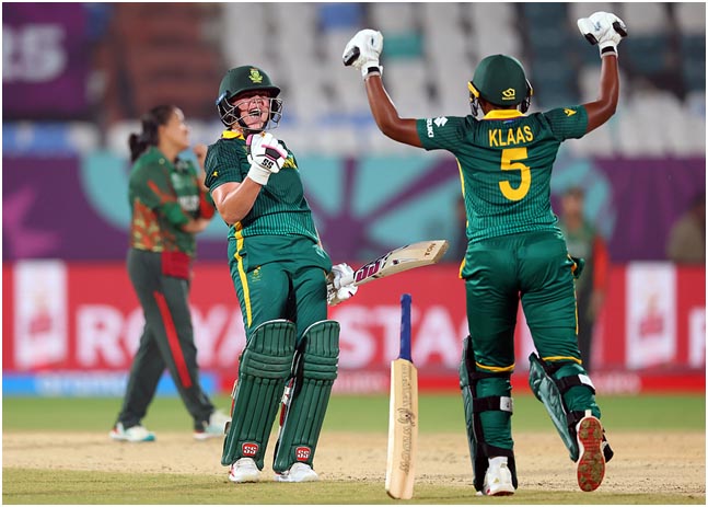 Vishakhpatnam, 14 October : ICC Women’s ODI Cricket World Cup te, South Africa kali rati Visakhapatnam te Bangladesh ke 3 wicket te harai loise ekta dangor close match te. Bangladesh pora diya 233 runs laga target chase kori thaka somoi te, South Africa Chloe Tryon laga kimti 62 runs (69 ball te) pora ekta hard-fought chase jitibo te safal hoise. Chloe Tryon ke Player of the Match award bhi dise.