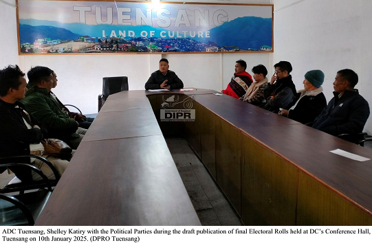 January 10, 2025, 06:07 PM: Itu Electoral Rolls laga Final Draft Publication loishey, itu sob Assembly Constituency khan nimitey, Tuensang District under tey, kuntu toh hoiley, Tuensang laga Additional Deputy Commissioner – Shelley Katiry laga under Chairmanship under tey loishey, 10th January, 2025 tey, Deputy Commissioner laga Conference Hall tey para, Tuensang laga, itu Special Summary Revision 2025 logotey connection thaki kena.