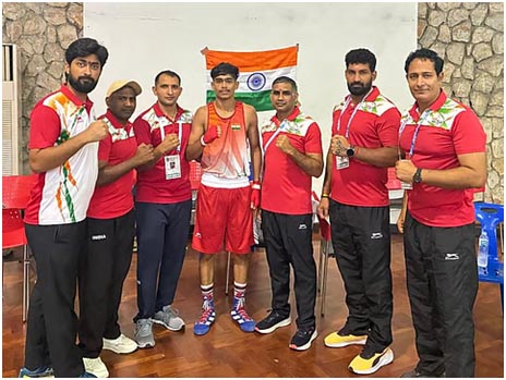 Shivam, jun men’s 55kg category te khele, Turkmenistan laga Bezirgen Annayev upor te pura tinte round dominate kori unanimous decision te jeet paise.
