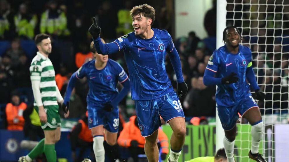 London, 21 December : Marc Guiu laga first-half hat trick Chelsea ke Thursday din Shamrock Rovers uporte 5-1 te jiti bole help korise, aru UEFA Conference League laga league phase 100% record te complete korise.
